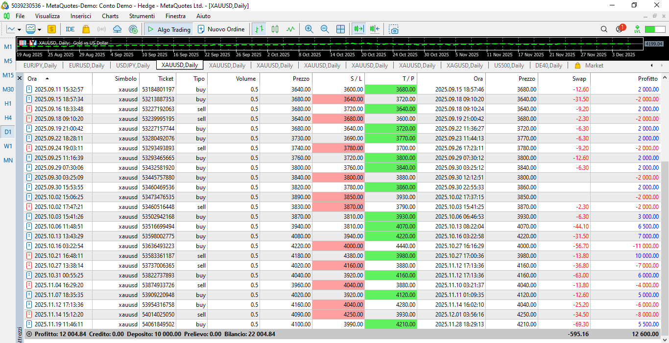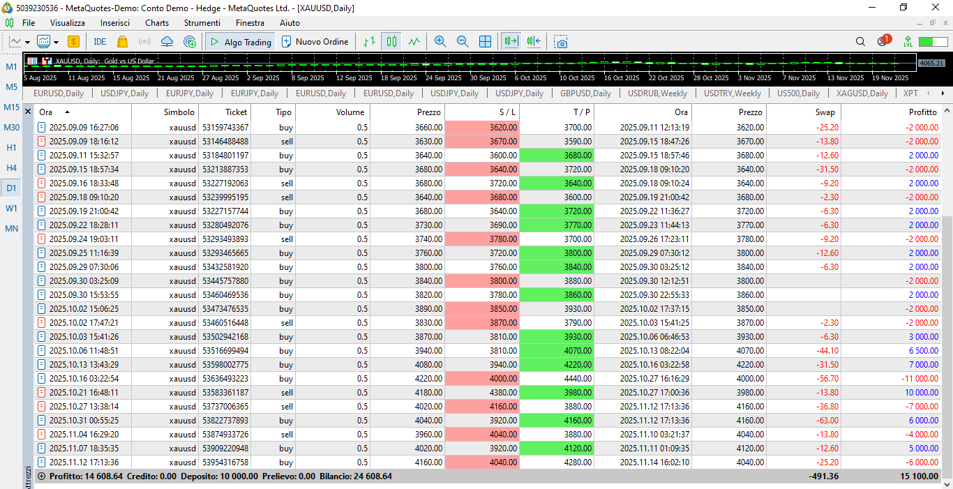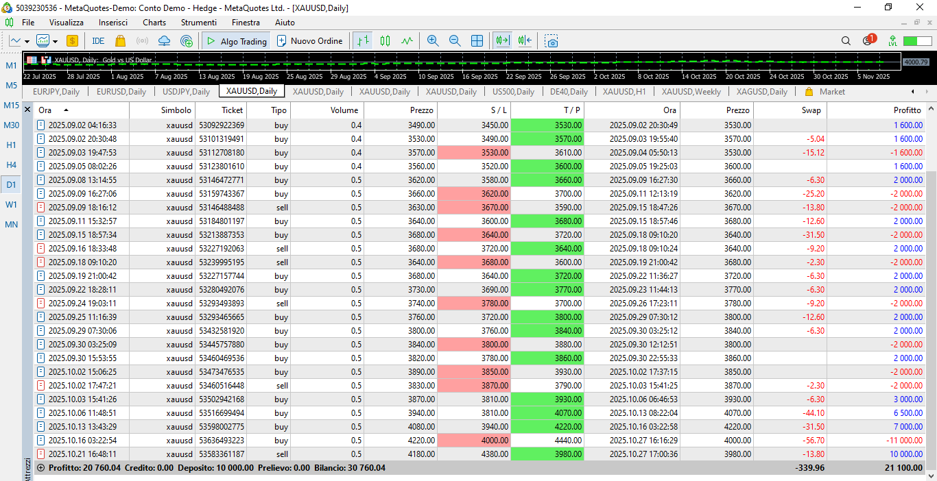 Economic Result achieved so far by the GOLD TRADING SYSTEM through a demo account - opened on 2025.05.07 - with an initial capital of € 10,000: